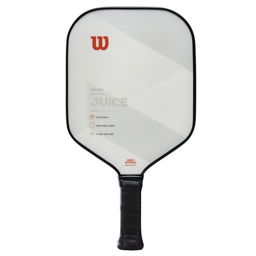Delivering an appealing combination of clean design and sheer power, Wilson’s all-new Juice paddle introduces a new wave of paddle performance to the pickleball court. The Juice features a printed spin tech on the paddle surface that increases ball rotation off the paddle surface, giving players the confidence they need to be aggressive with powerful shots when the situation warrants it. Sporting a wide body shape for a generous sweet spot and a core that impressively dampens vibrations, the USAPA-approved Juice feels great and performs even better.