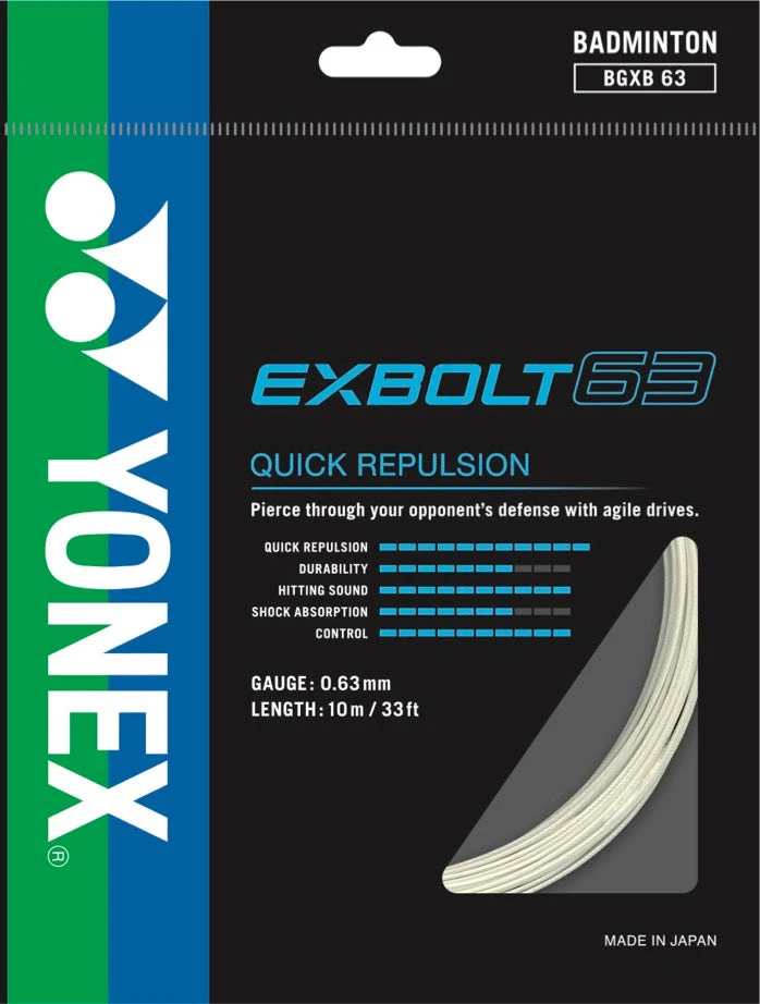 Exbolt; A brand new badminton string series from Yonex. The first of this new series is the Yonex Exbolt 63, made from a brand new material called Forged Fiber. A material which allowed a thinner gauged string to be constructed without compromising durability. Exbolt 63 combines durability, thin gauge and quick repulsion all into one.